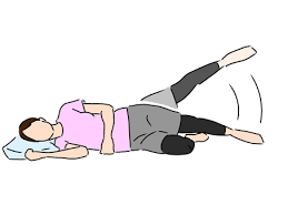 ①横向けに寝転がり、右足を曲げ呼吸をしながら左足を伸ばしたままゆっくり上にあげていきます